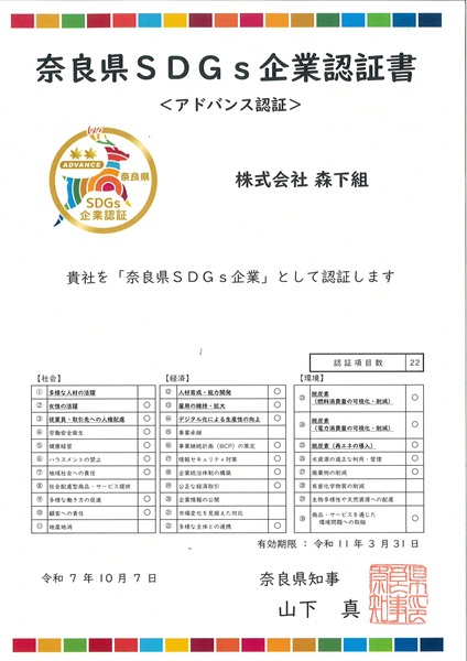 「奈良県SDGs企業 アドバンス企業」を取得しました。