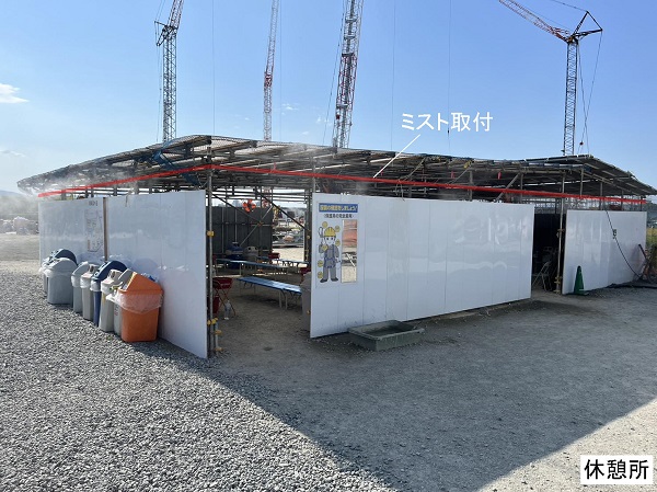 現場では、各工区の作業員が通る場所に休憩室を設けミストを取り付けるなどの熱中症対策も行なっています。
