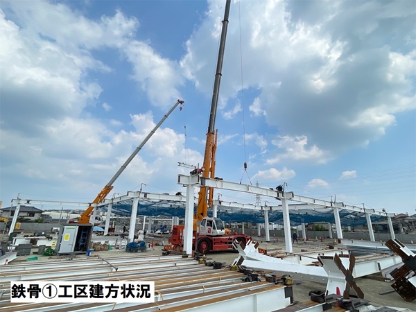基礎工事が完了、鉄骨の建て方を開始し、軸組の組立も完了すると建物の骨格がしっかりと形成されました。