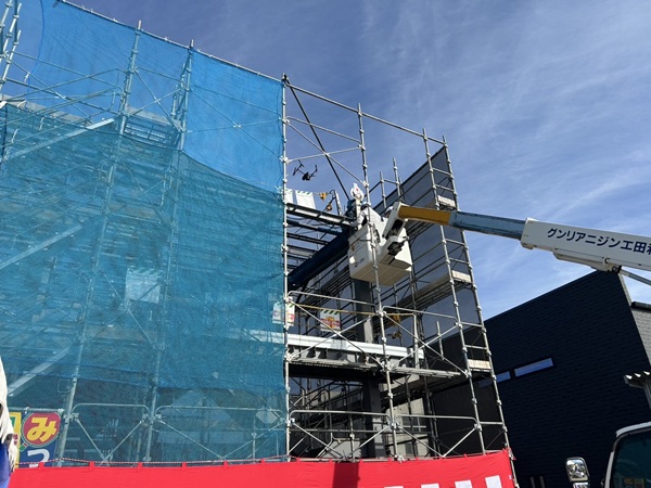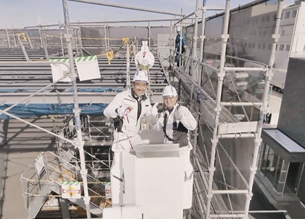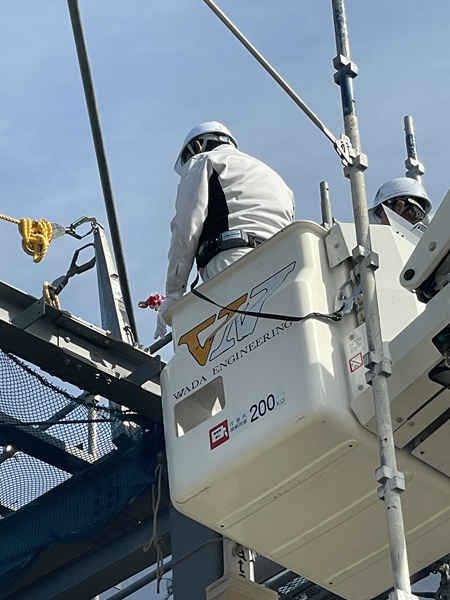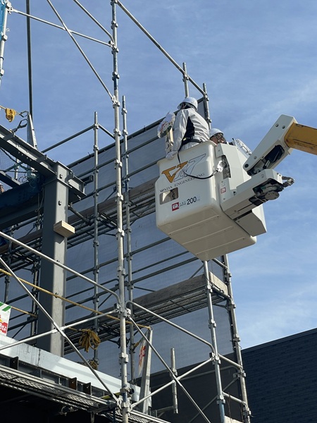 施主様と代表の職員の方が高所作業車に乗り込み、金ボルトと御幣を取り付けられました。