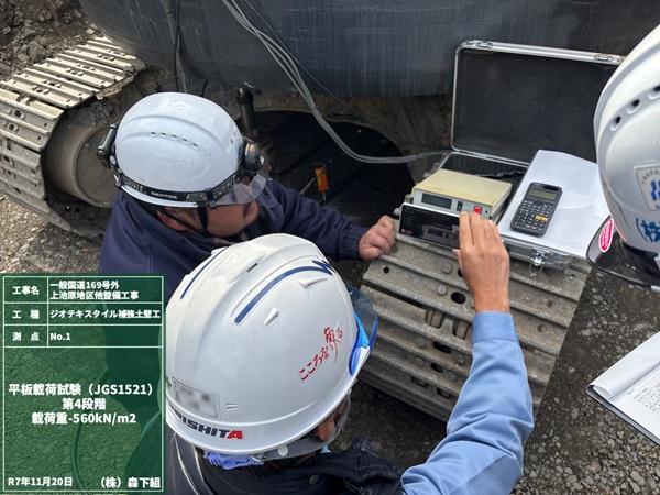 その後、補強土壁の床堀り完了後に、平板載荷試験を行いました。