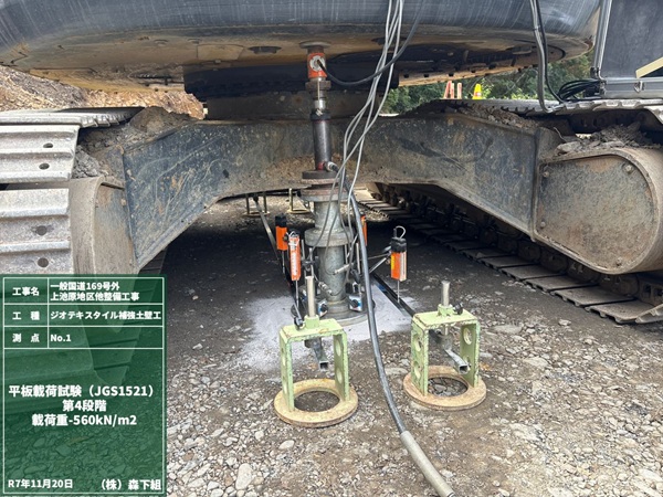 その後、補強土壁の床堀り完了後に、遠隔臨場(web)による平板載荷試験を行いました。