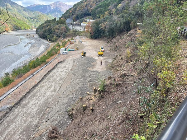 「上池原地区」では伐採を進めながら、工事用道路の盛土工を行い、
