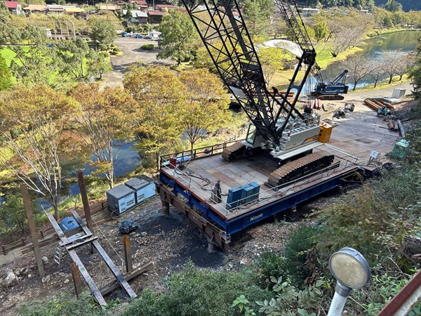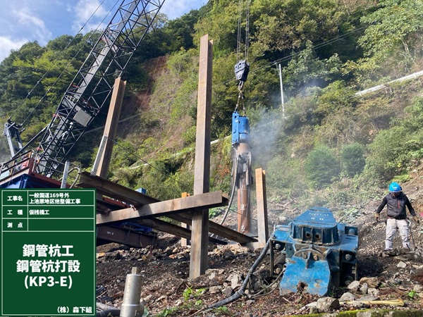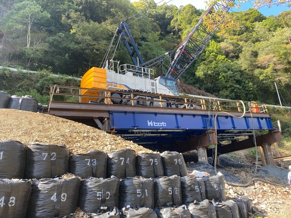 仮桟橋部では伐採完了後に、120tクローラークレーンを搬入し、スパン長17mの鋼管杭8本の打設を行い、「上池原地区」での施工は完了となりました。